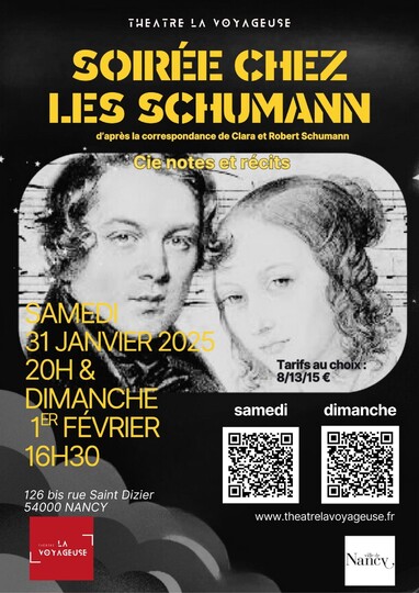 Servie par une comédienne, un chanteur et une pianiste, Soirée chez les Schumann nous transporte une heure durant en plein dix-neuvième siècle, dans la vie de ces deux icônes du romantisme. Le spectacle s’appuie sur des pièces pour piano, des lieder et des extraits du carnet intime de Clara et Robert.