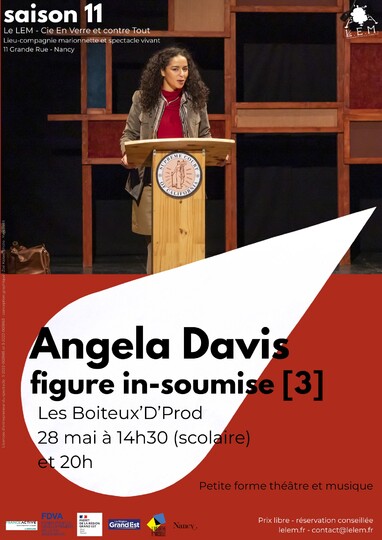 Angela Davis est le troisième volet des figures in-soumises, un projet d’Alexandre Picard initié en 2016 qui regroupe aujourd’hui trois petites formes théâtrales autour des notions d’engagement et de luttes contre les discriminations. Chaque spectacle met en lumière une figure historique et redessine les contours de son existence et de ses combats.